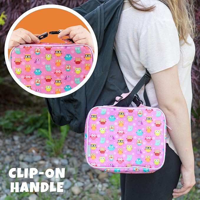 - Insulated Lunch Bag w/ Waterproof Lining & CLip-On Handle: Kids will love this fun owl print Bentology insulated lunch tote that keeps food and drinks fresh for hours! Stay hands free with this strong clip-on handle. Ideal for bringing your lunch or snacks to School, Summer Camp, Daycare and more! Keep lunches mess free with this easy to wipe waterproof lining. The slim sleeve design allows for easy storage without the bulk. Measuring 10 x 8 x 3 inches