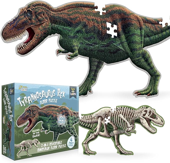 Tyrannosaurus Rex Dinosaur Jigsaw Puzzle | 100-Piece Double Sided Floor Puzzle with Glow-in-The-Dark Skeleton On Other Side | 4 FT Scientifically Accurate Dino Illustration | Educational Toy for Kids
