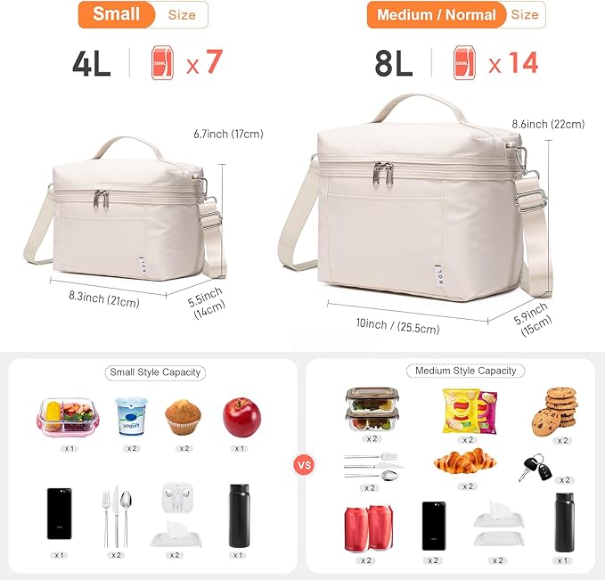 - Dimension & Capacity: this lunch box comes with two sizes: Small size: L8.3 x W5.5 x H6.7 inches, capacity: 4L, Medium size: L10.24 x W5.91 x H8.66 inches, 8L. Actually, the small size one can fit 6 cans of cola or 2 standard bento boxes+some fruits, it is a good choice for women. And the medium size one is a normal size of lunch bag.