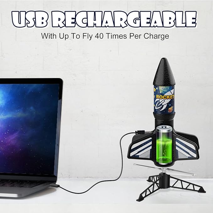 - Rechargeable Rocket: This motorized rocket toy is powered by high quality lithium batteries. Fully charged in 40 minutes, the rocket launcher toy can fly up to 25-40 times, which depend on the heights mode you choose. Saving the cost and trouble of replacing the battery.