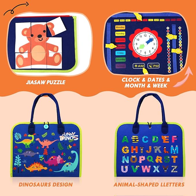 - 【Montessori Busy Board】Hooku Toddler Busy Board feature 4 different pages of activities to developing fine motor skills, plus an animal-shaped alphabet and lovely dinosaurs on its front & back covers. In addition, the flexible zipper allows it to divide into 2 busy boards so 2 kids can play together!