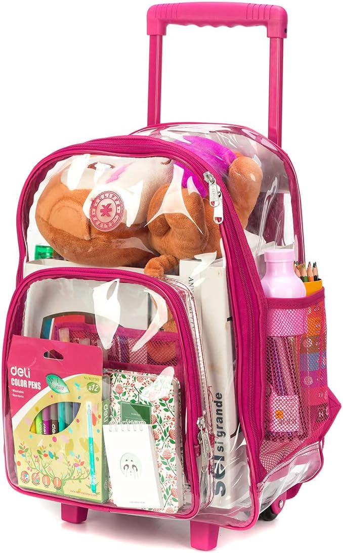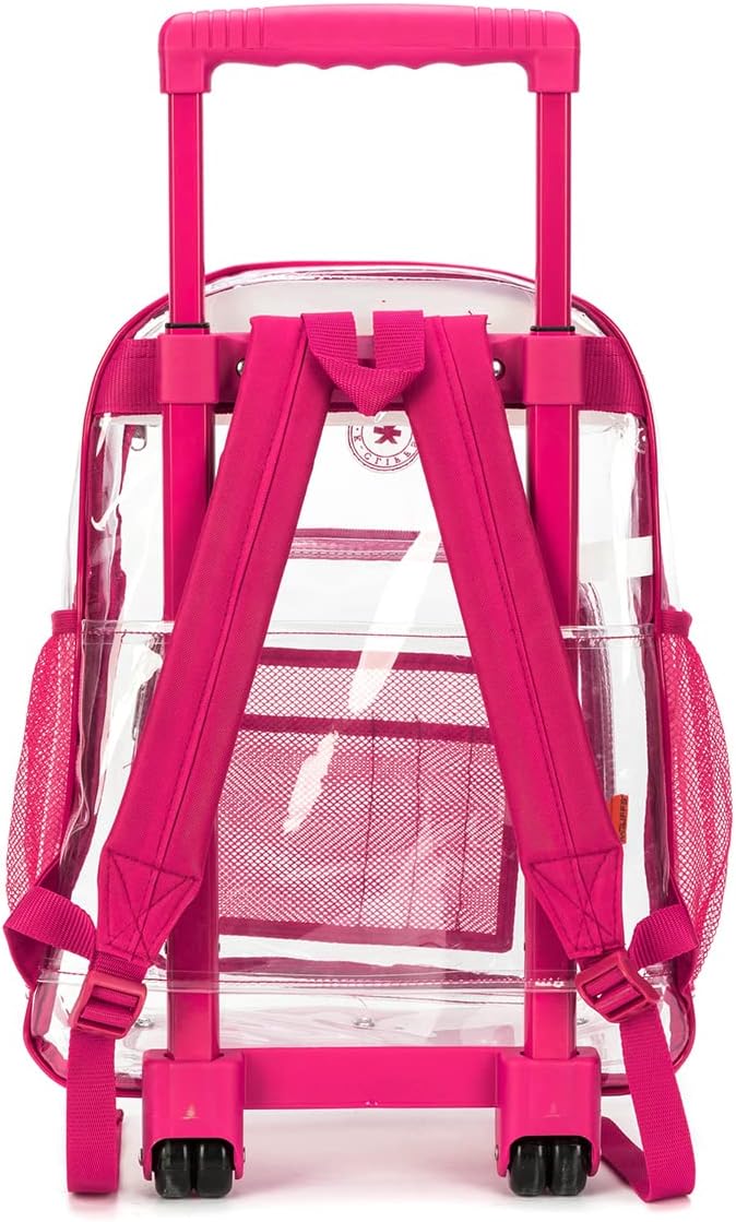 K-Cliffs Rolling Clear Backpack Heavy Duty Bookbag Quality See Through Workbag Travel Daypack Transparent School Book Bags w/Wheels Hot Pink