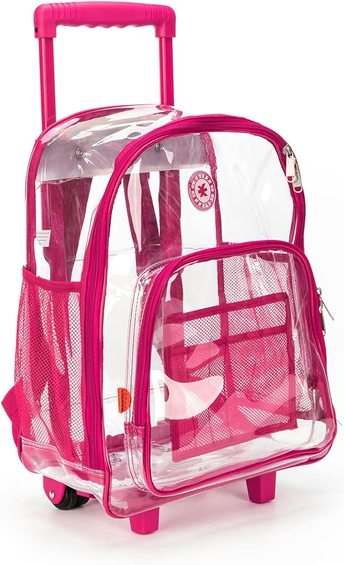 - Heavy Duty Rolling Clear Backpack with mesh organizer in front pocket & mesh pockets on both sides.