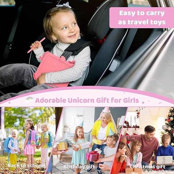- ๐ฆAdorable Unicorn Gift for Girls: Unicorn is the best friend of little girls, our newest unicorn LCD writing tablet will be a nice playmate. Toddlers can freely enjoy painting and doodling without making a mess on the wall, windows, or floor. Lightweight and convenient to carry with for travel or outdoor activities. The scribble drawing board will keep your girls excited and engaged for hours.