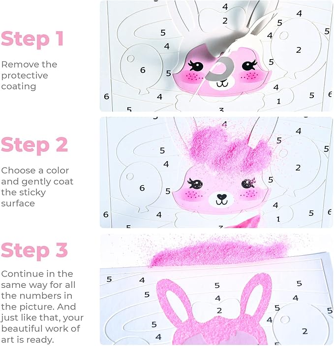 - Sticky Number Sand Art: Instructions are simple: Take a pallet with stickers and a sand art sheet; Separate the sticker square from the pallet and glue it on a square of the same color as the picture. Decorate with additional rhinestones.