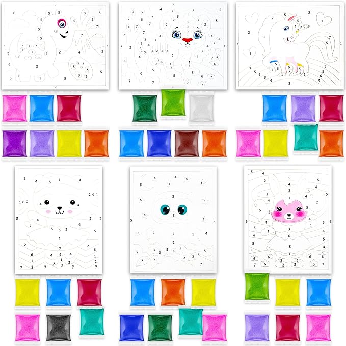 - Colored Sand for Sand art: This set includes 6 pictures of your favorite cartoon characters. Art Sand can become a great and fun hobby for your kids.
