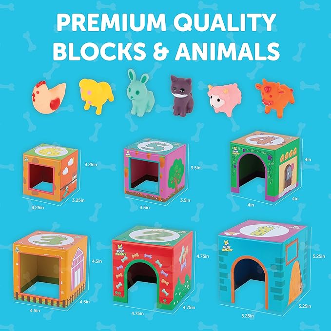- PREMIUM STACKING BLOCKS. This set has 6 animal toys matched with 6 nesting boxes, printed with large numbers and fancy objects for counting and recognition. Crafted with sturdy vinyl paper, this stacking toy for toddlers ages 1-3 can withstand water damage and are made non-slippery so little hands can grip this tightly.