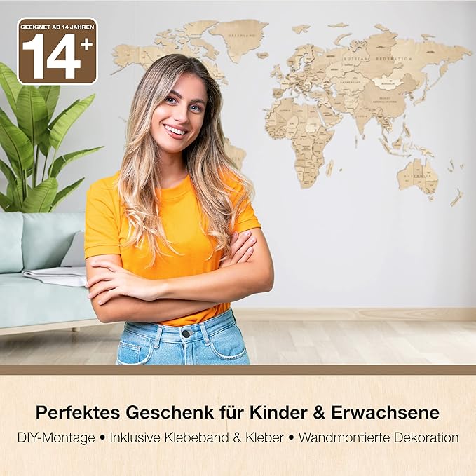 - Ready, Set, Assemble: Our wood world map puzzle kit comes with pre-cut parts from plywood sheets, double-sided adhesive tape, glue, and precise assembly instructions in 8 languages, including German.