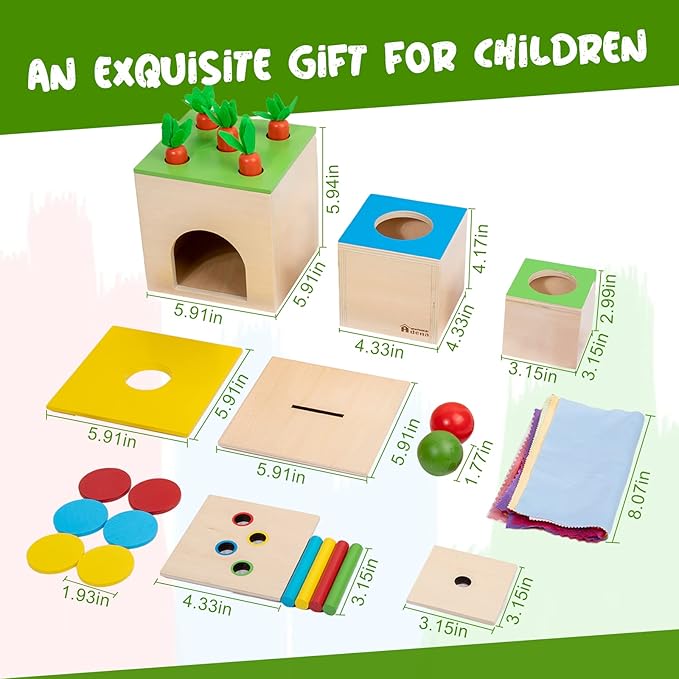 - 🌈【Versatile Playset for Babies】The Object Permanence Box, Montessori Coin Box, Carrots Harvest Toy, Box Stacking Game, Paper Game and Sticks Matching Game. Montessori 6 in 1 Play Kit Toy is a great choice for parents who want to provide their babies with a fun and engaging playset. With six different ways to play, this toy set will keep your baby entertained and engaged for hours on end.