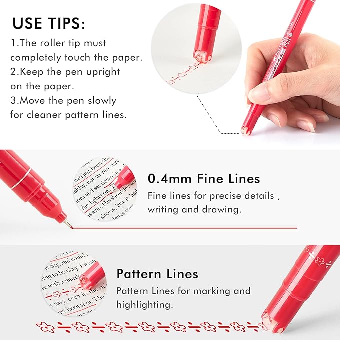 - Use Tips: Here are some tips when using the pattern pens: 1.The roller tip must completely touch the paper so that ink will come out smoothly. 2.Keep the pen upright on the paper to get a complete pattern. 3.Move the pen slowly while marking for straighter and clearer pattern lines. 4.Please recap the pen every use for pleasent performance