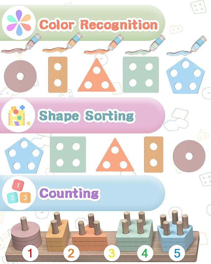 - DESIGN FOR TODDLERS: Our montessori toyis an easy game that involves mounting one piece on top of the another piece. The geometric blocks have the same size but different colors and shapes. While stacking the blocks, children need to sit and balance core muscles to move hands freely and figure out which shape fits where. This kind of activity will help your toddlers to control their body movement and learn shape and geometry, build color recognition and exercise kids’space conception.