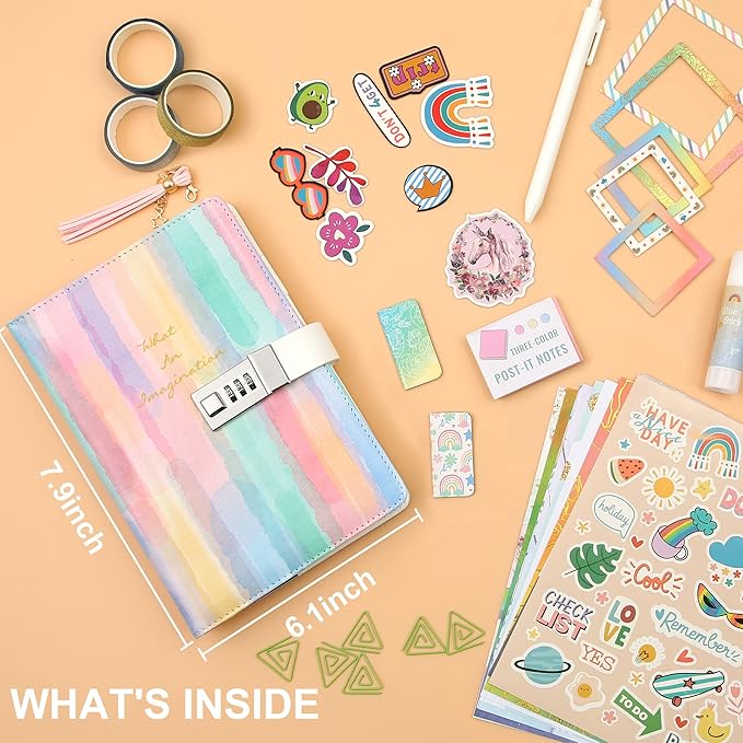 - DIY Journal Kit Include: Girls journal set was beautifully packaged, include 1 beautiful lockable journal, 9 cardboard cutouts, 5 paper frames, 8 scrapbook pages, 30 stickers, 2 magnetic bookmarks, 1 glue stick, 1 tassel with charm, 1 pen, 3 colors sticky notes,3 glitter tape rolls, 6 paper clips.