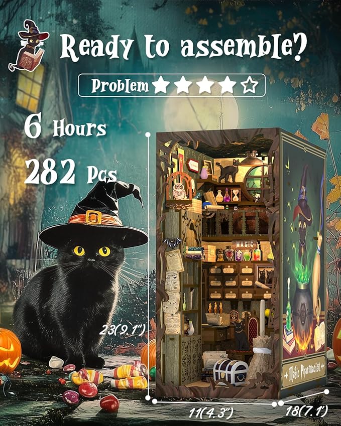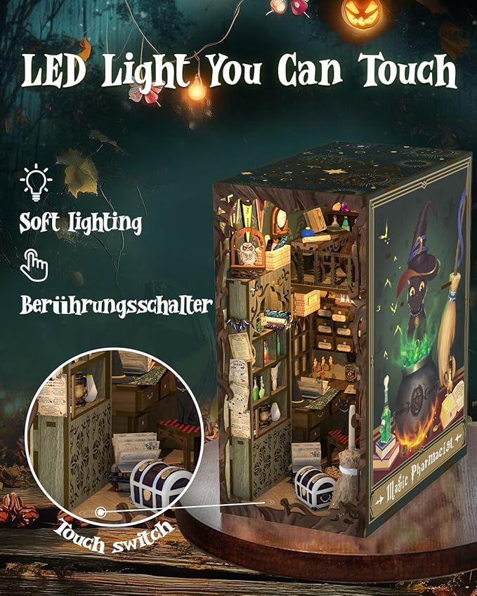 - 【Design Concept of DIY Book Nook Kit】The enigmatic and magical design, let you immerse yourself in the fantasy magic world. In a magic house located deep within the forest, the magic apothecary is reading magic books and attempting to make medicine in an effort to master a mysterious power through magic to change the world and open the door to the magic world, leading us step by step on the journey of a fantastic adventure. The crucible, potion bottle, black cat, magic book, broom makes it delicate and mysterious.