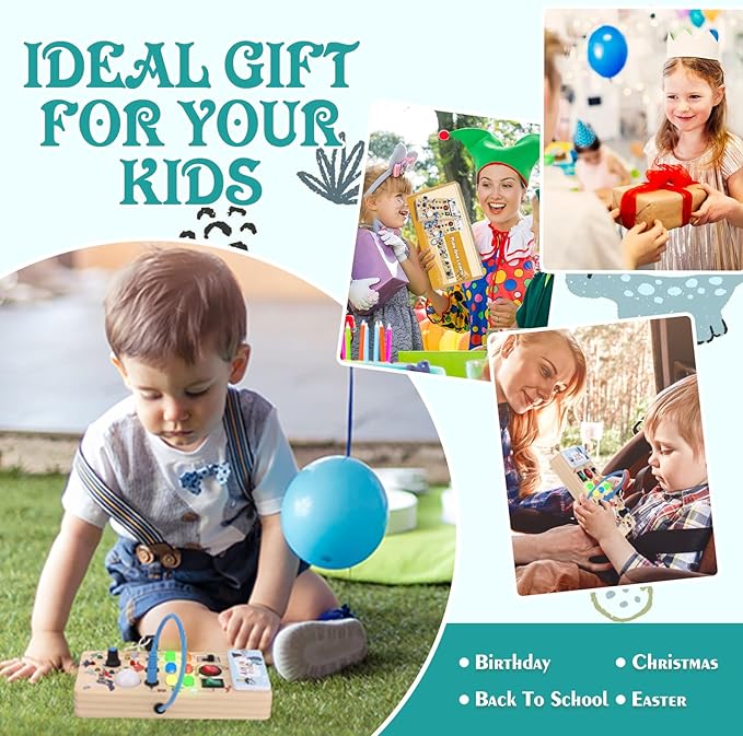 - 【Toddler Busy Board】This busy board is set with 8 different switches and LED lights in different styles and colors. Cute dinosaur elements are designed on the wooden panel. The brightness of each LED light is adjusted to be just right for the children's eyes. This busy board for 1 year old is perfect for kids who love LED light switches and dinosaur toys.