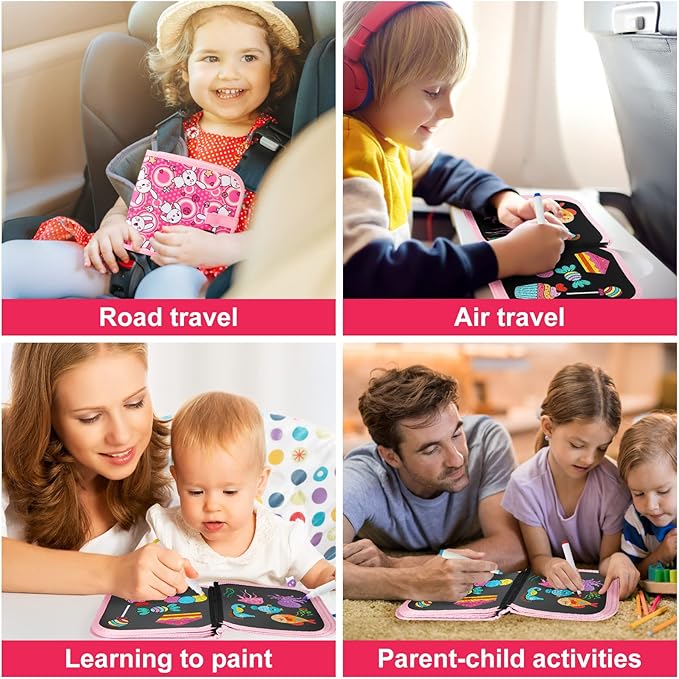 - ๐จKid's Road Trip Essentials--Kids Erasable Graffiti Book has sticky buttons on the outside to keep it in place and a pens pocket on the inside for 12 watercolor pens. Even in cars, planes and other means of transportation, kids can draw as much as they want.