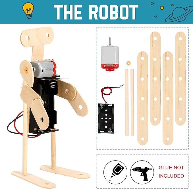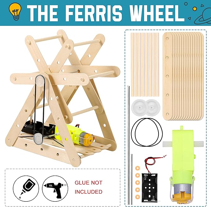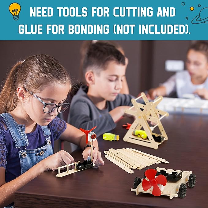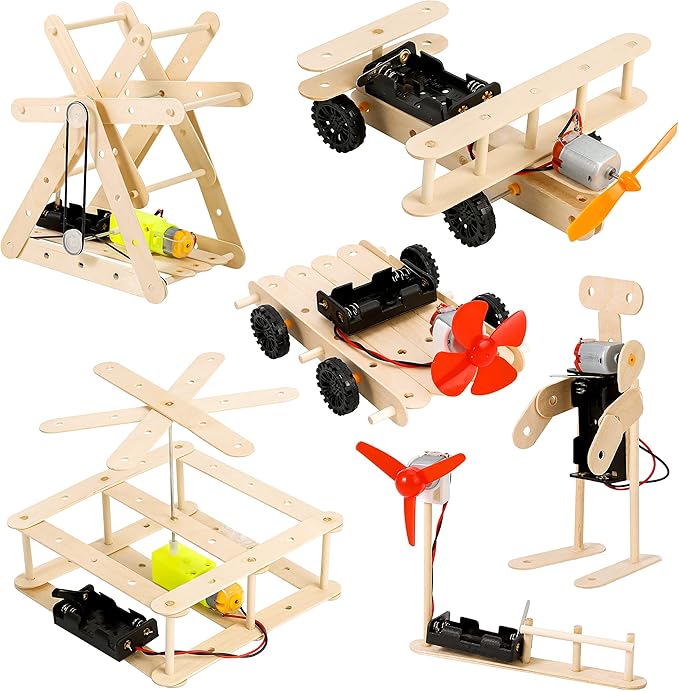 - Complete Circuit Kit: Coming with instruction, 6 AA size battery holder (2 x 1.5V), 2 TT motors, 4 motors, 2 motor holders, 1 propeller with 4 vanes, 1 propeller with 3 vanes, 1 propeller with 2 vanes, 8 iron shafts (2 x 1.97”, 2 x 3.15”, 2 x3.94”, 4.72”), 22 shaft sleeves, 2 wheels, 2 pulley, 2 drive belt, 50 popsicle sticks, 50 dowel rods, packaged with enough circuit accessories for you making science project easily