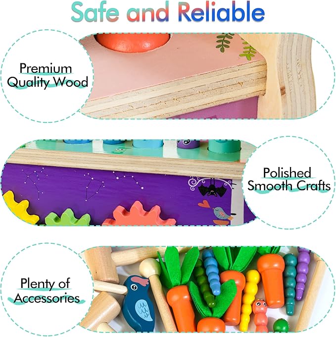 - 【6 IN 1 WOODEN TOY SET】This interactive toy allows your kids to play 6 games in 1 toy: mole-tapping, magnetic woodpecker catches worms, carrot harvest game, playing the xylophone, number & time cognition, gear rotation.