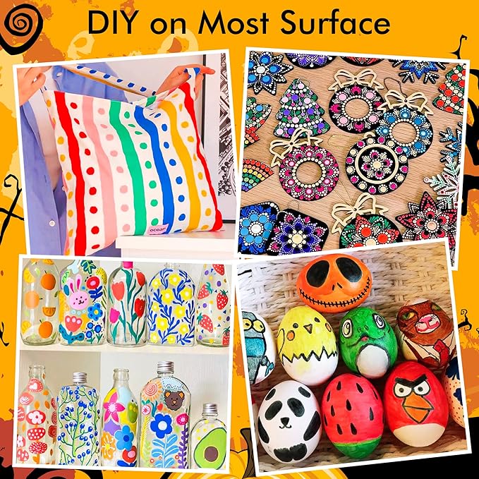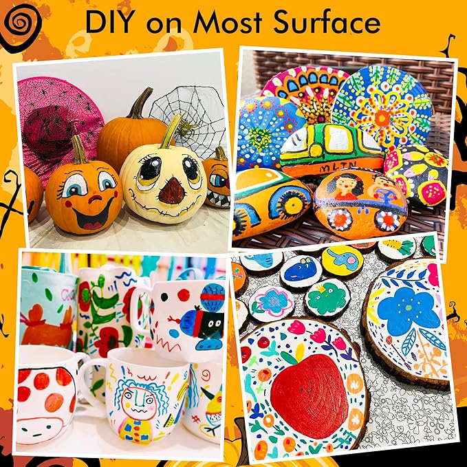 - 【MULTI-PURPOSE】: Enjoy creating art projects on a variety of surfaces, acrylic paint marker set suitable for rock painting, ceramic and mug painting, glass and wine glass painting, wood, fabric, stone, metal, plastic, canvas, Christmas ornament, Halloween pumpkin painting, scrapbook, bullet journal, custom mugs, DIY crafts projects, and much more for both smooth and porous surfaces.