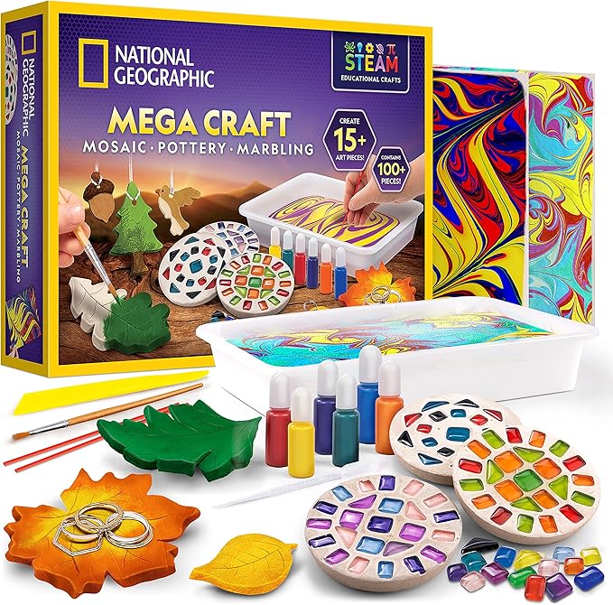 National Geographic Mega Arts and Crafts Kit for Kids – Mosaic Kit, Marbling Paint Kit & Air Dry Clay Pottery Kit – Art Projects for Kids Ages 8-12, Crafts for Girls and Boys (Amazon Exclusive)
