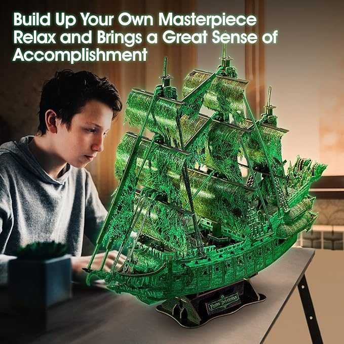 - UNIQUE GREEN BRIGHT DESIGN - The green glow of the Flying Dutchman puzzle is designed to highlight the unique features of this ghost ship. For the best brightness, expose the puzzle to light for 10 minutes before displaying it in a dark room. Add excitement to your puzzle collection!