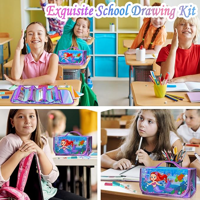 - 【Durable Portable Tote Bag】 The mermaid case contains four zippered compartments, making it easy for your little girl to keep her pens organised. When she is finished coloring, she can stow the case away, closing it with a velcro fastener. It super easy for kids to travel with it with the carry handle, whether in the play house game or on holiday. It can also be used for things such as makeup case or a carry case for other mermaid toys.