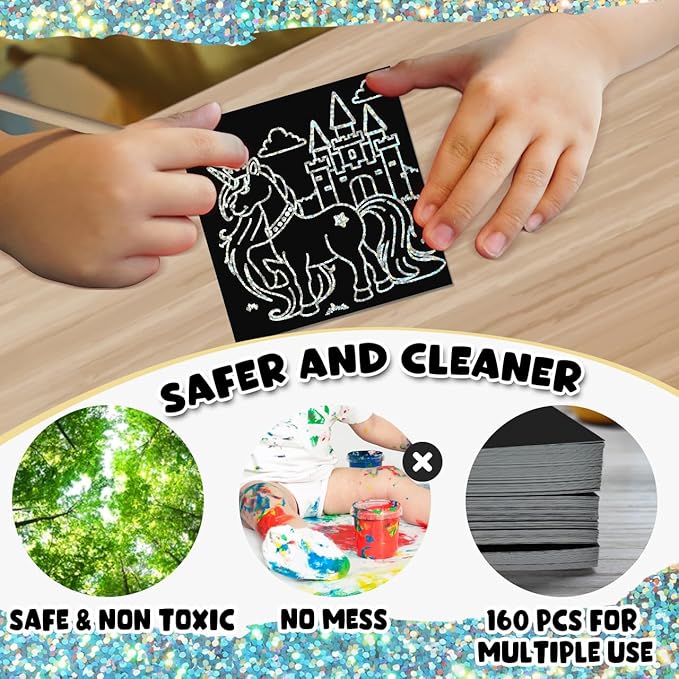 - Silver Scratch Art Mini Notes: Our scratch art paper with 160 sheets of holographic scratch paper note cards (Size: 3.5*3.5inch /8.5*8.5cm) and 5 Styluses(3.5inch/8.5cm). Super Bulk kids art craft kits for fun way to doodle, leave notes, write Lists and and create cool illustrations and designs. Both kids and adults love exercising their imaginations with this bulk art craft gift