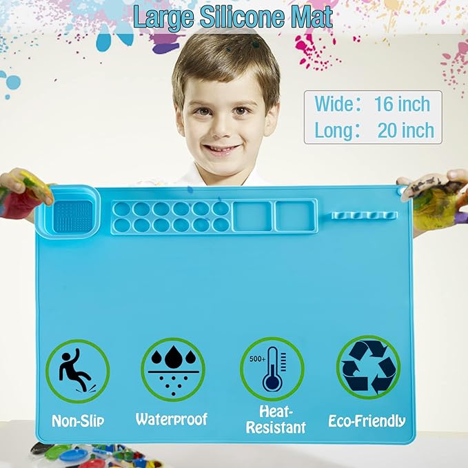 - Food Grade Painting Mat: The silicone art mat with palette and cup Made of 99.99% food grade silicone, safe to use. Non-stick, non-skip, waterproof, easy to clean, stain , heat resistant, not easy to deform or tear up, ideal for protecting surfaces from paint, heat tools, glue and more