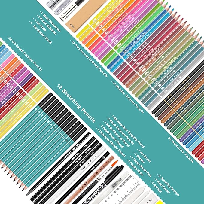 - Artist Pencils - This drawing set includes 91 pieces Drawing Pencils:12 Sketching Pencil,3 Charcoal Pencil,24 Colored Pencil,24 Watercolor Pencil,12 Metallic Pencil,12 flourescent color pencils,1 white charcoal pencil,1 colorless blender pencil,1 eraser pencil,1 woodless graphite pencil.Each pencil is marked with color name and number.our pre-sharpened art pencils for accurate visual creativity and crisp lines.Soft break-resistant cores produce incredible tone.