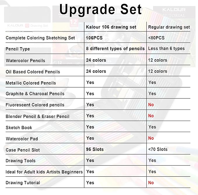 - Complete Art Set - Kalour 106 art set contains all the art pencils you need,Variety of pencil types and Vivid Color for you to do any artworks.Perfect for sketching,drawing,blending,coloring and shading.