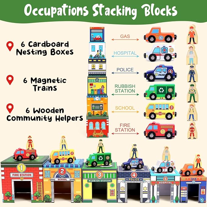 - Stacking and Nesting Blocks - Upgraded stacking toys blocks come with 6 nesting boxes including police, hospital, school, fire/ gas/ rubbish station, 6 community helpers and 6 wooden cars with magnets. The stacking building blocks are printed with corresponding occupation images and numbers. Our blocks for toddlers 1-3 can be nested for easy storage
