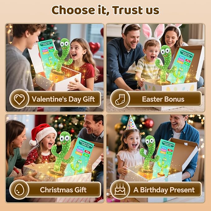 - CACTUS BABY TOY : Talking cactus toy is a great gift for kids or friends. This amusing toy is guaranteed to bring laughter to anyone who receives it! The mimicking cactus toy can record and replay your words. It dances, sings, and is suitable for babies, toddlers, and kids. Additionally, it can serve as a charming room decoration.
