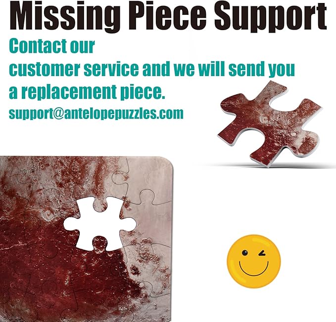 - Missing piece support: We understand the frustration of completing a puzzle only to find a missing piece. That's why we provide dedicated customer support to help you replace any missing pieces. Simply reach out to us, and we'll make sure you have all the pieces you need to complete your puzzle.