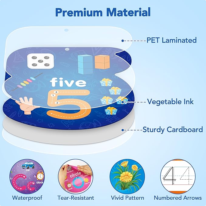 - Premium Material - Made of sturdy cardboard, tear-resistant. Printed with vegetable ink, vibrant and clear. Double sides are PET laminated, waterproof, dry erase and reusable. Smooth edges, burrs-free, safe for kids' little hands. Each cards measures about 8 x 9 inches.