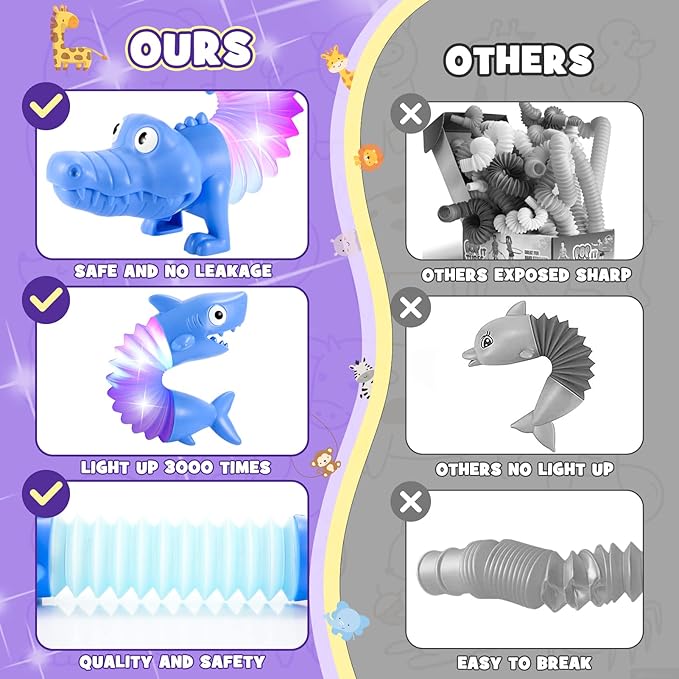 - Animal Fidget Toys for Kids: This pop tubes for toddlers have 6 different animal shapes(long-necked dinosaurs, giraffes, triceratops, crocodiles, dolphins and sharks), which can be retracted and deformed freely with pop sound. This sound will attract your little one's attention and drive away boredom