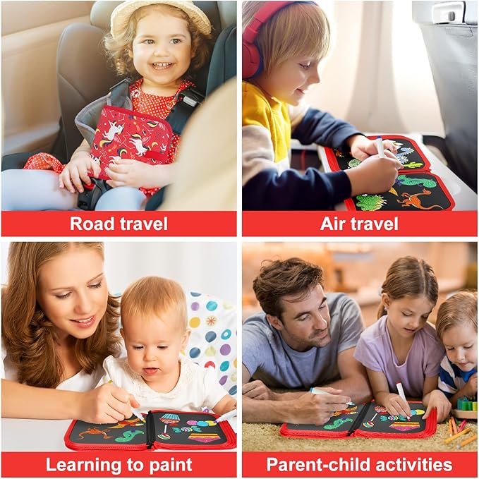 - ๐จKid's Road Trip Essentials--Kids Erasable Graffiti Book has sticky buttons on the outside to keep it in place and a pens pocket on the inside for 12 watercolor pens. Even in cars, planes and other means of transportation, kids can draw as much as they want.