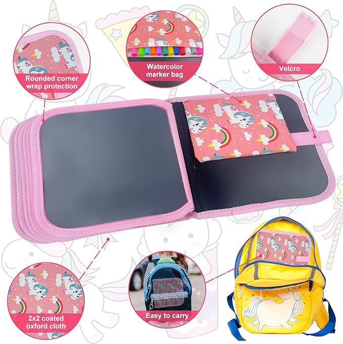 - ๐จKid's Road Trip Essentials--Kids Erasable Graffiti Book has sticky buttons on the outside to keep it in place and a pens pocket on the inside for 12 watercolor pens. Even in cars, planes and other means of transportation, kids can draw as much as they want.