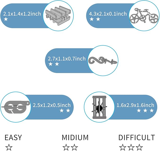 - 【Novelty Concept】Get an assortment of 6 different metal puzzles, ranging from easy to hard levels, making it fun for everyone. Whether you enjoy playing alone or with friends, these brain teaser puzzles for adults are guaranteed to offer hours of entertainment.Plus, with the included storage box, you can easily collect all the pieces and avoid losing them. If you're not sure how to solve a particular puzzle, the instruction manual will provide all the guidance you need.