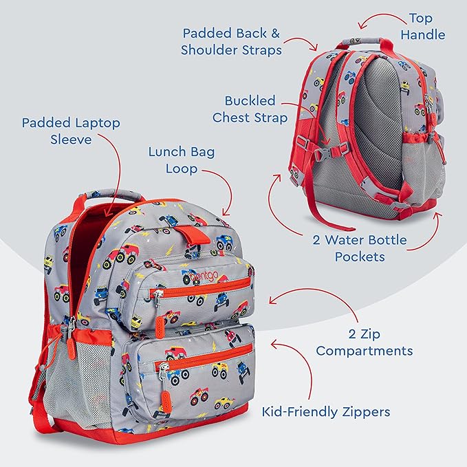 Bentgo Kids Backpack - Lightweight 14” Backpack in Fun Prints for School, Travel, & Daycare, Ideal for Ages 4+, Roomy Interior, Durable & Water-Resistant Fabric, & Loop for Lunch Bag (Trucks)