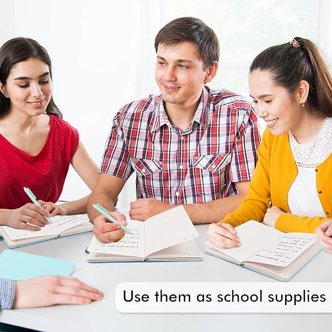 - feela 24 Pack Classic Ruled Notebooks contains 24 sky blue ruled sturdy cover notebooks and 24 Black Retractable Pens. Each of the notebooks measures 8.3” x 5.1”, which is perfect to carry and easily held by young girls and boys. These black cute pens are customized to be placed in the pen holder, which is pretty convenient.