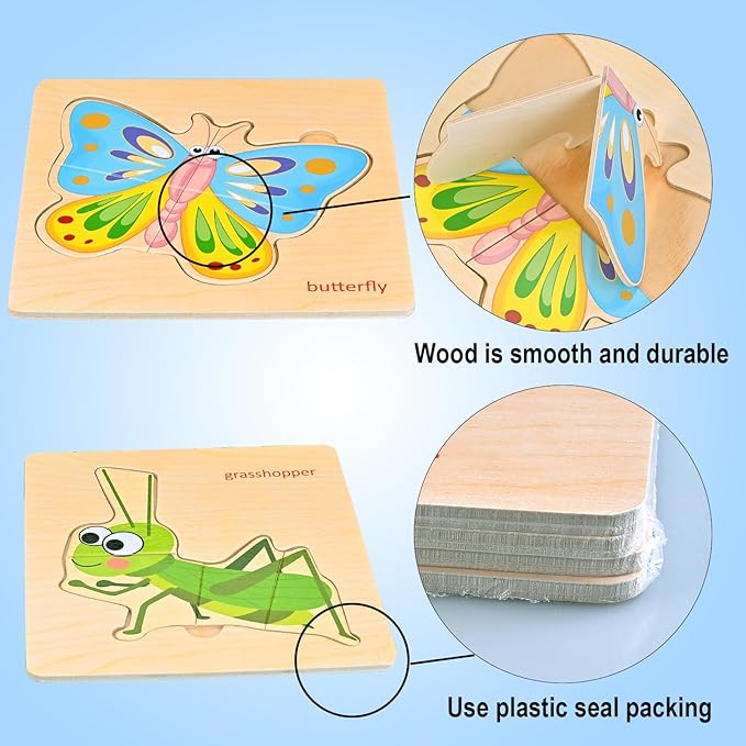 - 【Toddler Toys & Gifts】--Cute Animal Pattern toddler wooden puzzles for Child- Each kids puzzles has the name of the animal written on it. Insect puzzles include: bee, butterfly, grasshopper, snails, ladybug, dragonfly, ant, caterpiller.