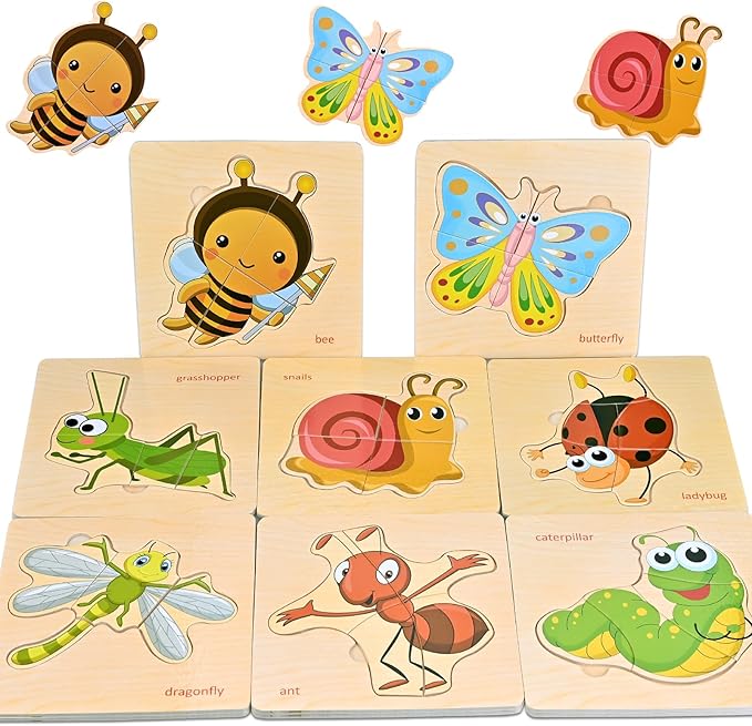 - 【Perfect Toddler Puzzles】---8pcs puzzles for kids, insect animal shape. These wooden jigsaw puzzles are the perfect size (5.8*5.8*0.15in) for toddlers.