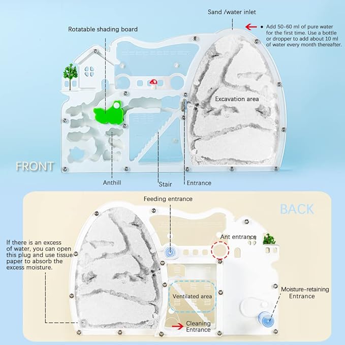 - 【Easy to Use】The ant farm is easy to set up and use, making it an ideal choice for beginners. Our ant castles are designed with unique holes that makes easier for loading ants into the container and feeding them with food and water.Water Tips : Add 50-60 ml of pure water for the first time . Use a bottle or dropper to add about 10 ml of water every month thereafter. The water is used to maintain humidity and prevent the sand from drying out.