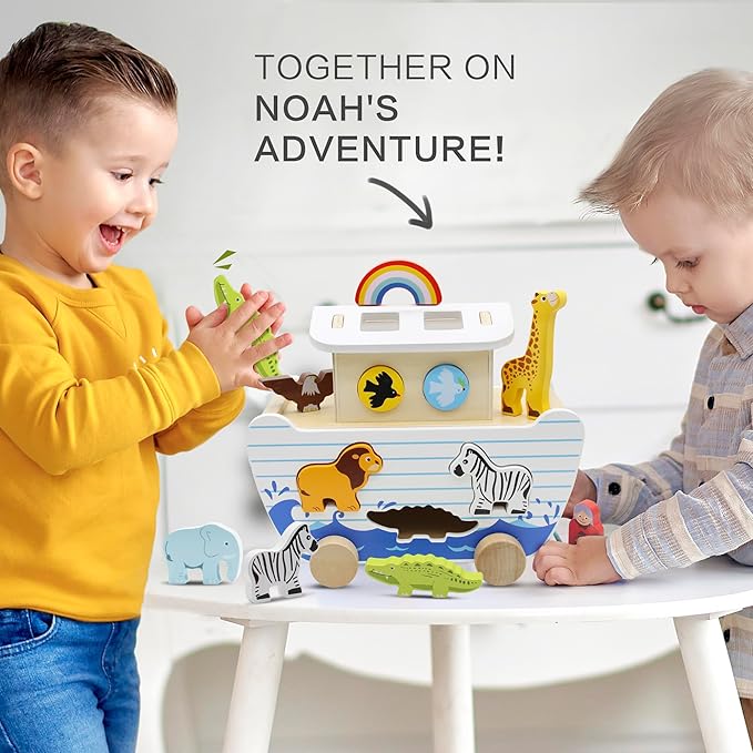 Noah's Ark Wooden Toy Set, Educational Wooden Animal Toys for Toddlers, Montessori Shape Sorter Educational Toys, Bible Story Engagement & Perfect Baptism, Christening Gift for 2-4 Y