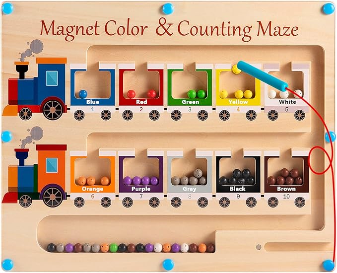 - 【Magnetic Counting Matching Game】Bright color and number maze with a magnetic pen for children hand-on to move the magnetic beads from the track to the carriage. The wooden montessori toy develop kids’ patience, will not make the child feel irritable. Find the corresponding color and count while walking, focus on counting and color recognize. Preschool classroom must haves.