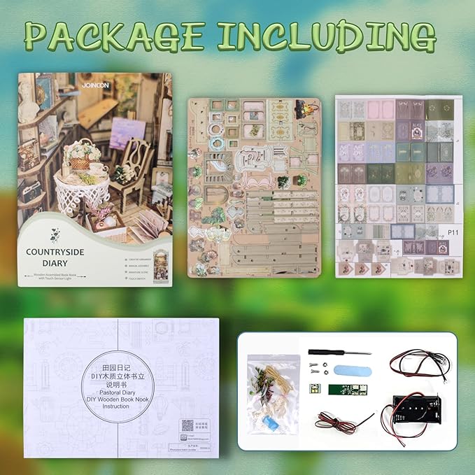 - โ ใService Guaranteeใ:This diy bookcorner kit has been 100% carefully checked before leaving the factory to ensure that the accessories are complete and not lost. Warm Tips: You need to prepare the silicone liquid glue and two batteries (type AA) by yourself, because transportation by air is prohibited. Dust cover and music box are also not included, please confirm this information before placing your order.