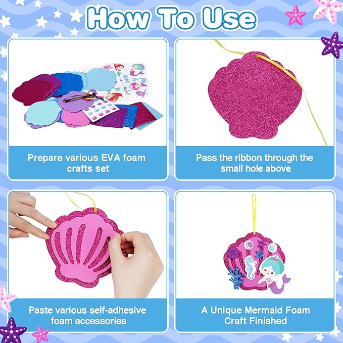 - Mermaid Craft Kit for Kids:The EVA foam art crafts for kids includes 8 pack of mermaid craft sets.There are 4 different designs,shell foam stencils, mermaid, octopus, seahorse, turtle and other foam sticker accessories.A lot of foam stickers enough quantity to meet needs on a activity for kids,kids can make their own mermaid arts crafts set!