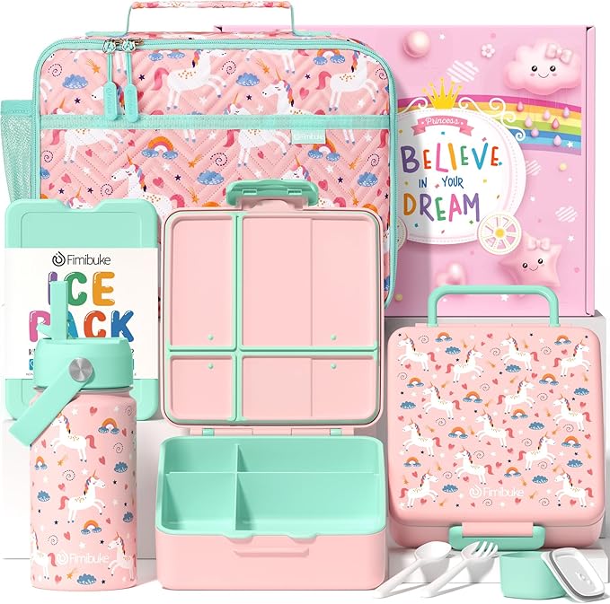 - 7PCS KIDS SCHOOL LUNCH BOX GIFT SET: Fimibuke kids lunch box set provides an one-stop solution for kids school lunch or snacks packing and carrying, this all combined gifts box comes with a 100% leak-proof bento box, a 14oz water bottle insulated, a kids insulated lunch bag, an ice pack, a sauce jar, a set of utensils and an exquisite gift box. Perfect for ages 3-12 kids to daycare, nursery school, preschool, kindergarten, elementary school, back to school or summer camp with a healthy lunch
