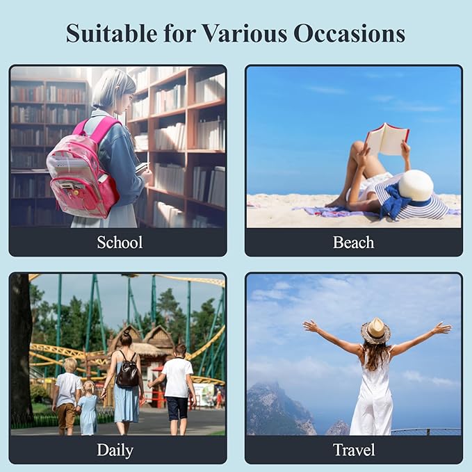 - Versatile and Convenient: This stylish clear plastic backpack is perfect for men, women, and boys girls students in any setting – whether it's school, work, or travel. With ample space for all your essentials, it eliminates the need for multiple bags, providing great convenience. It's the perfect gift for your family and friends, offering both style and functionality!