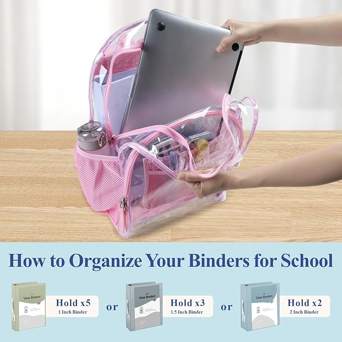 - Spacious and Organized: This large clear backpack measures 12.6" x 6.7" x 17.1", offering ample space for binders, laptop, notebooks, and more. With 1 main compartment, 1 front zipper pocket with mesh slots, and 2 side pockets for a water bottle and umbrella, it keeps your school essentials neatly organized and easily accessible.