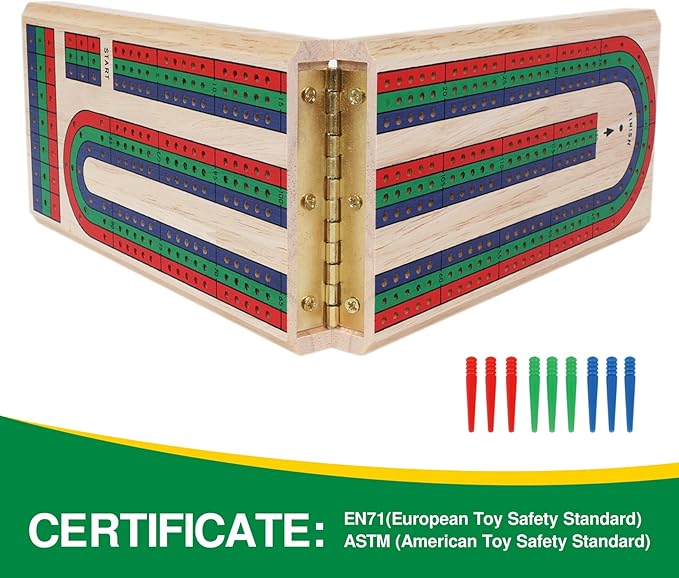 - 【CLASSIC CRIBBAGE GAME】Our folding cribbage board is pocket-sized and easy to carry, measuring 7.3" when folded and 14.5" when unfolded. Made of superior rubber wood, which is tough and dense, well-constructed and feels smooth. This game board is built to last and features a three-row scoring board with built-in storage channel for the nine multi-colored plastic pegs.